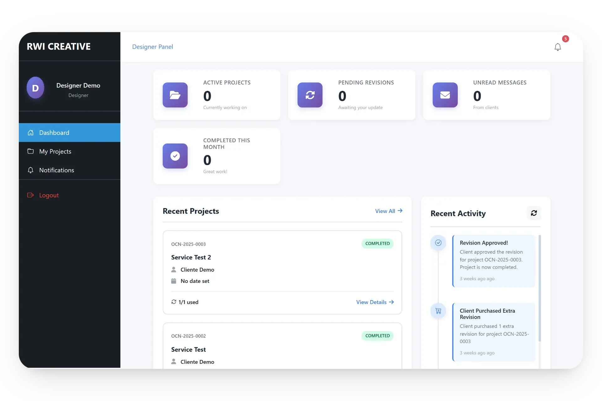 El sistema integra paneles independientes según el rol del usuario, ofreciendo una experiencia optimizada para cada perfil. Los clientes, una vez contraten un servicio pueden crear un proyecto, enviar briefs y comunicarse con su diseñador en tiempo real; los diseñadores gestionan sus tareas, revisiones y entregas desde un panel dedicado; y los administradores controlan todo el ecosistema con herramientas avanzadas de gestión, reportes, formularios dinámicos y soporte interno.